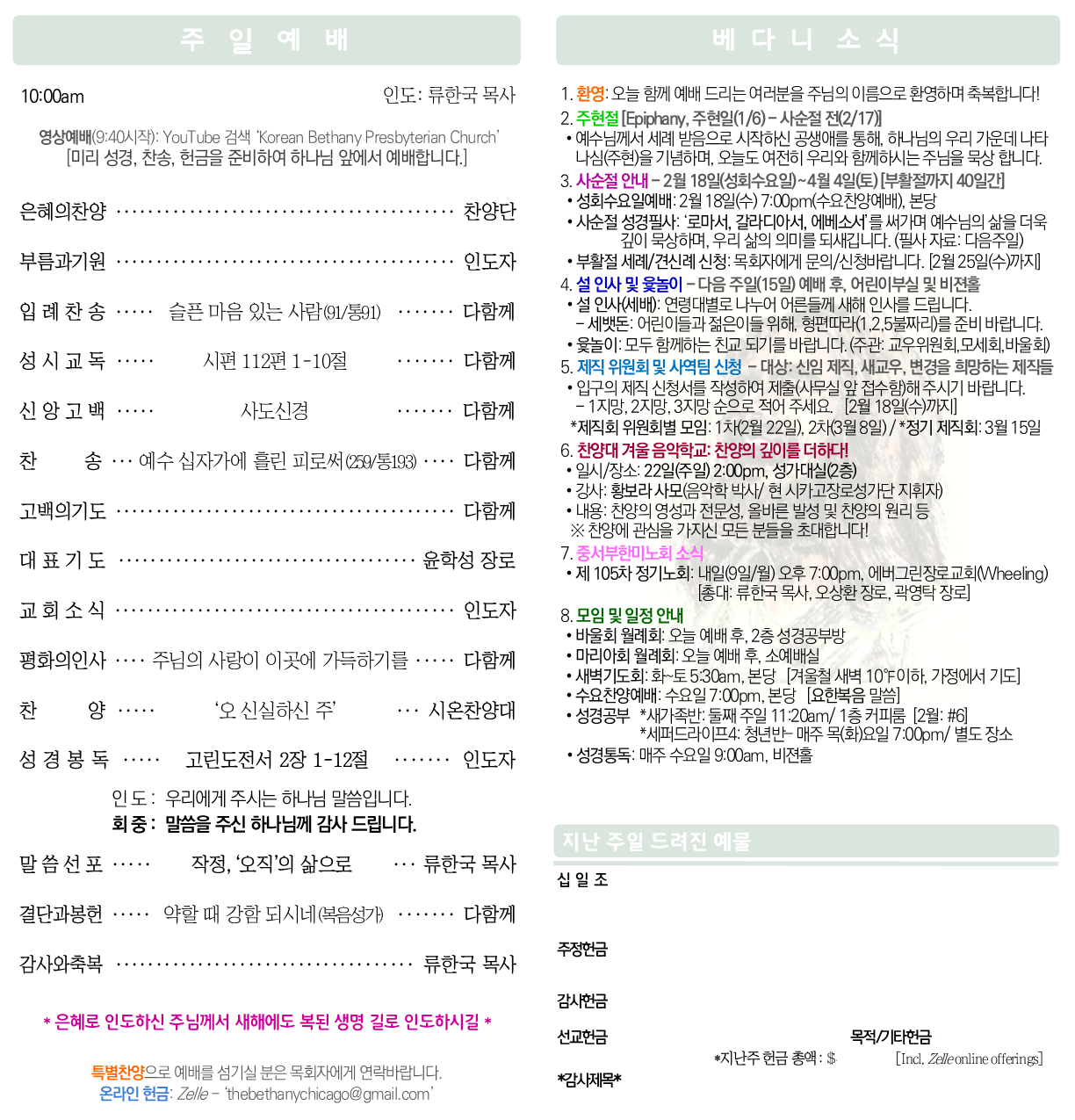 2026년 2월 8일 주보 Korean Bethany Presbyterian ChurchFebruary 7, 2026 Facebook0 Twitter LinkedIn0 Reddit Tumblr 0 Likes