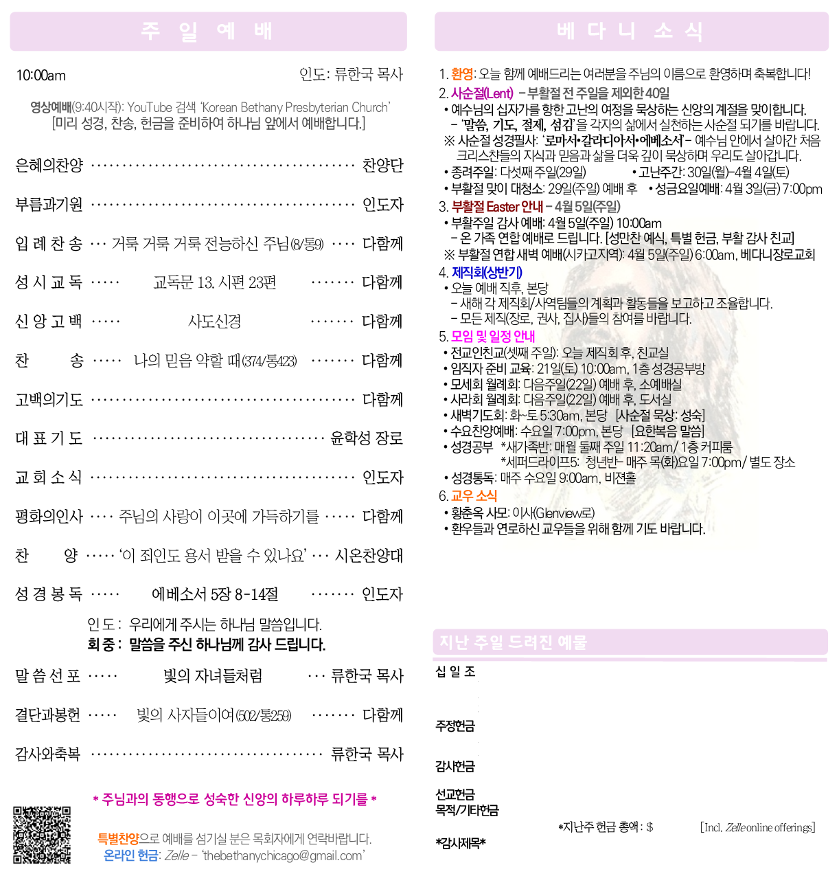 2026년 3월 15일 주보 Korean Bethany Presbyterian ChurchMarch 14, 2026 Facebook0 Twitter LinkedIn0 Reddit Tumblr 0 Likes