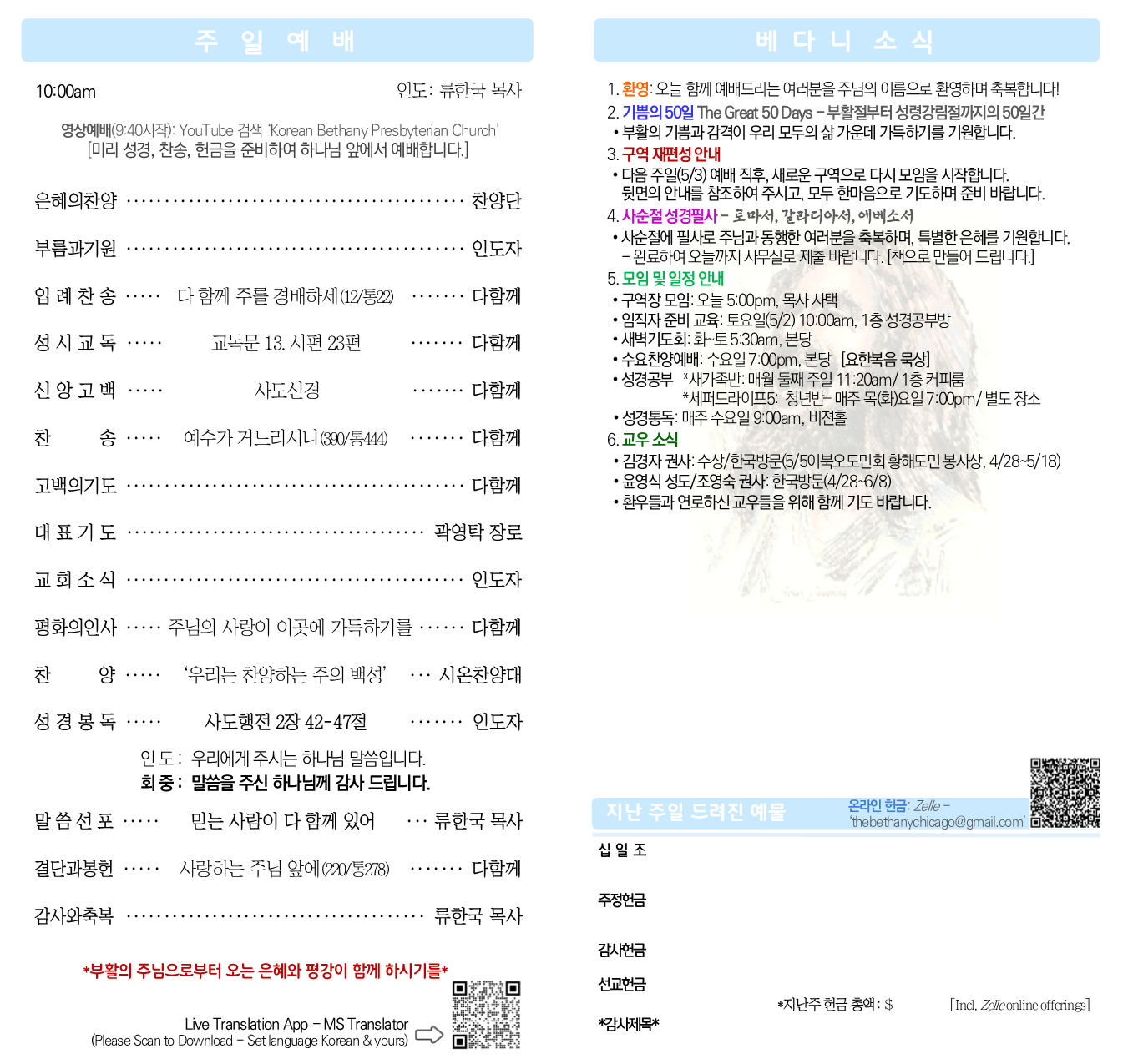 2026년 4월 26일 주보 Korean Bethany Presbyterian ChurchApril 25, 2026 Facebook0 Twitter LinkedIn0 Reddit Tumblr 0 Likes